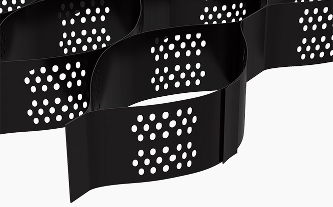 Основные технические характеристики объемной георешетки включают высокую устойчивость к температурным перепадам, от -60°C до +60°C, и долгий срок службы — не менее 50 лет. Ячейки георешетки могут иметь разную высоту (от 50 до 300 мм) и диагональ (от 150 до 300 мм), а толщина стенок варьируется от 1,1 до 4,5 мм. Для фиксации модулей используются пластиковые, металлические анкеры или железная арматура, что обеспечивает надежное крепление конструкции. Благодаря своей структуре, объемная георешетка не подвержена коррозии, гниению и воздействию агрессивных сред, что делает её идеальным материалом для экстремальных условий эксплуатации.